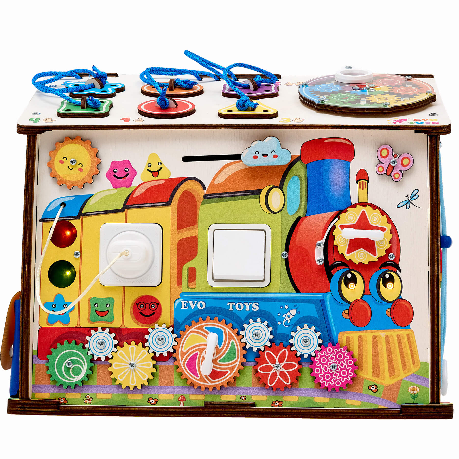 Главный элемент – забавный паровозик с колесами-шестеренками с удобной ручкой для вращения влево и вправо. На вагоне расположены две разноцветные лампочки и двухклавишный выключатель для их включения. На кабине находятся вилка с розеткой, которые зажигают фары поезда, и трещотка, стимулирующая межполушарное развитие мозга ребенка. Над паровозиком помещены лабиринт с тучкой и подвижное солнышко для укрепления пальчиков рук малыша.